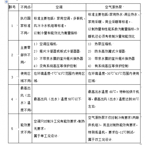 由于兩種產品的使用對象不同,決定他們采用的標準、選用的零部件、使用的地域、出風(或出水)溫度、能效等均不同,列表分析如下: